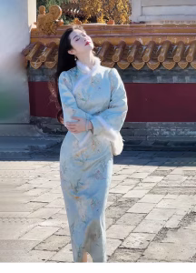 [Tongjun]桐君Chinese cheongsam woolen sliver splicing dress long skirt
